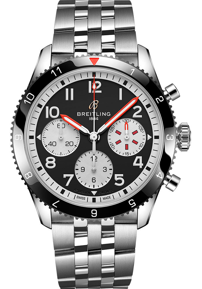 42.0 mm stainless steel case, 14.7 mm thick, screw-locked crown with two gaskets, bidirectional ratcheted bezel, black dial, Breitling 23 self-winding movement, approximately 48 hrs of power reserve, stainless steel bracelet. Water resistant to 10 bars.