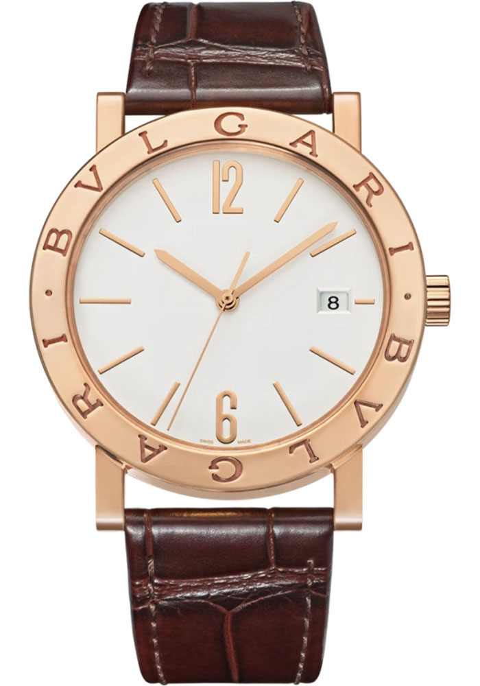 38 mm 18K rose gold case embodies a story of bold creativity, 18K rose gold crown, double logo engraving bezel, blue marble dial, BVL 191 caliber automatic movement with hour-minute-seconds-date functions, approximately 42 hours of power reserve, matching blue alligator leather strap, pin buckle. Water resistant to 50 m.
