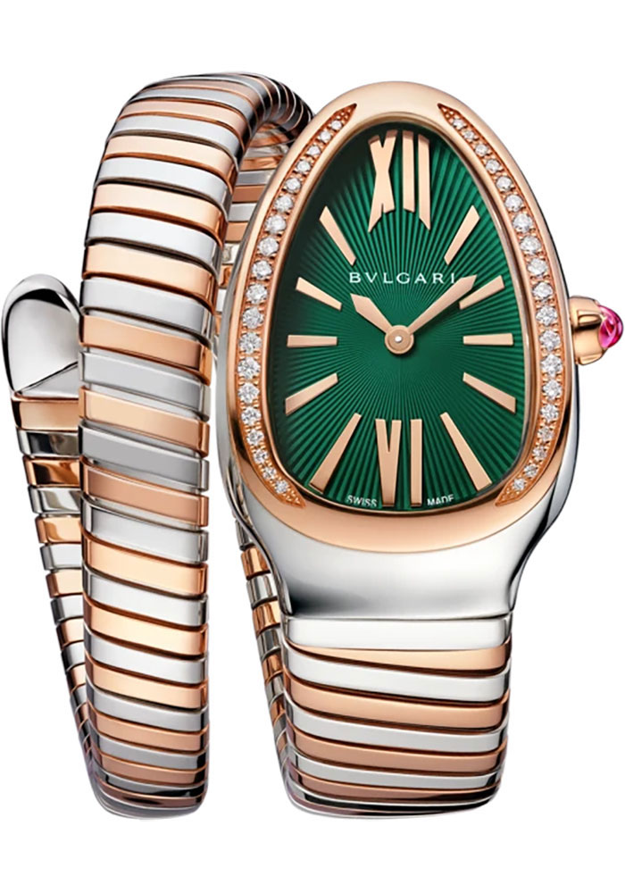 35 mm stainless steel curved case, 18K rose gold crown set with a cabochon-cut rubellite, diamond-set bezel and a green lacquered soleil dial, green lacquered soleil dial, quartz movement with hour-minute functions, serpenti tubogas single-spiral rose gold and steel bracelet in 18 kt rose gold and stainless steel. Water resistant to 30 m.