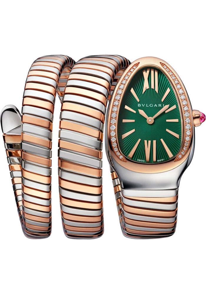 35 mm 18K rose gold and stainless steel case, 18K rose gold crown set with a cabochon-cut rubellite, 18K rose gold bezel set with round brilliant-cut diamonds, green lacquered soleil dial, quartz movement with hour-minute functions, serpenti tubogas double-spiral steel and gold bracelet in 18 kt rose gold and stainless steel. Water resistant to 30 m.