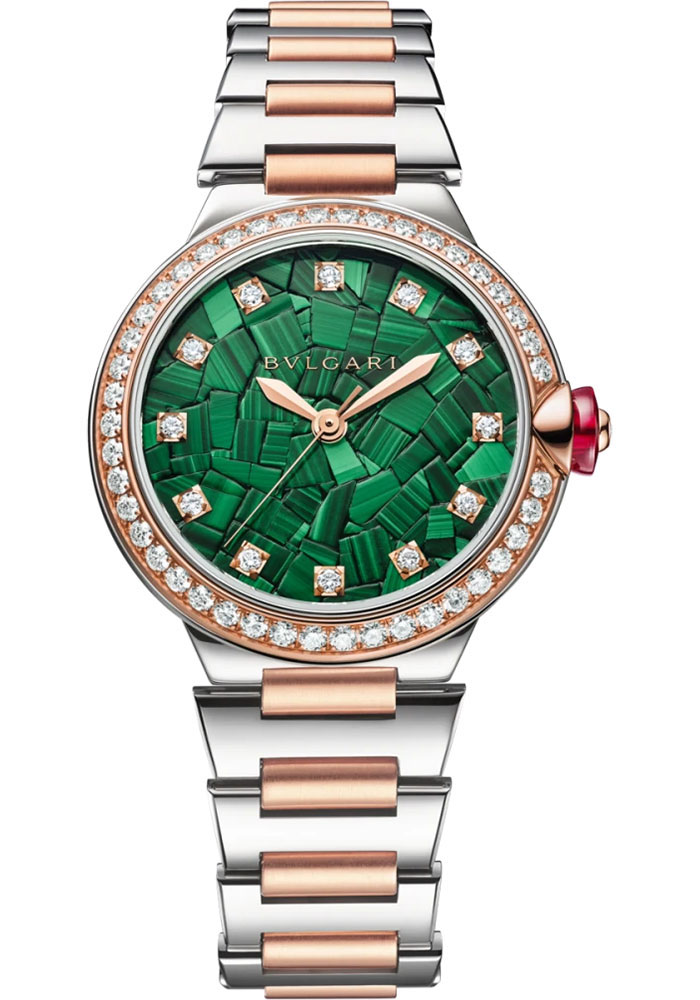 33 mm polished steel case, 12 round brilliant-cut diamond indexes and cabochon-cut synthetic pink sapphire crown set with a diamond, diamond-set 18K rose gold bezel displays the integral bond between Bvlgari’s jewelry savoir-faire and watchmaking expertise, green malachite marquetry dial, automatic movement with hour-minute-seconds-date functions, approximately 42 hours of power reserve, rose gold and steel bracelet in 18 kt rose gold, folding buckle. Water resistant to 50 m.