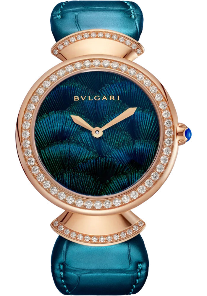 33 mm rose gold case, 18K rose gold crown set with a cabochon-cut blue sapphire, 18K rose gold bezel, natural peacock-feather dial, quartz movement with hour-minute functions, matching green alligator leather strap, bracelet and 18 kt rose gold pin buckle. Water resistant to 30 m.