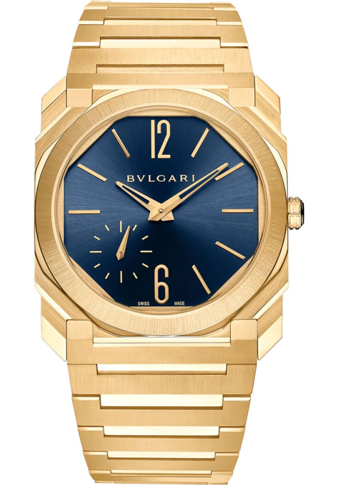 40 mm extra-thin satin-polished 18K yellow gold case, 18K yellow gold screw-down crown set with a black ceramic insert, blue lacquered dial with sunray finishing, BVL 138 caliber automatic movement with small second functions, approximately 60 hours of power reserve, yellow gold bracelet with folding buckle. Water resistant to 100 m.