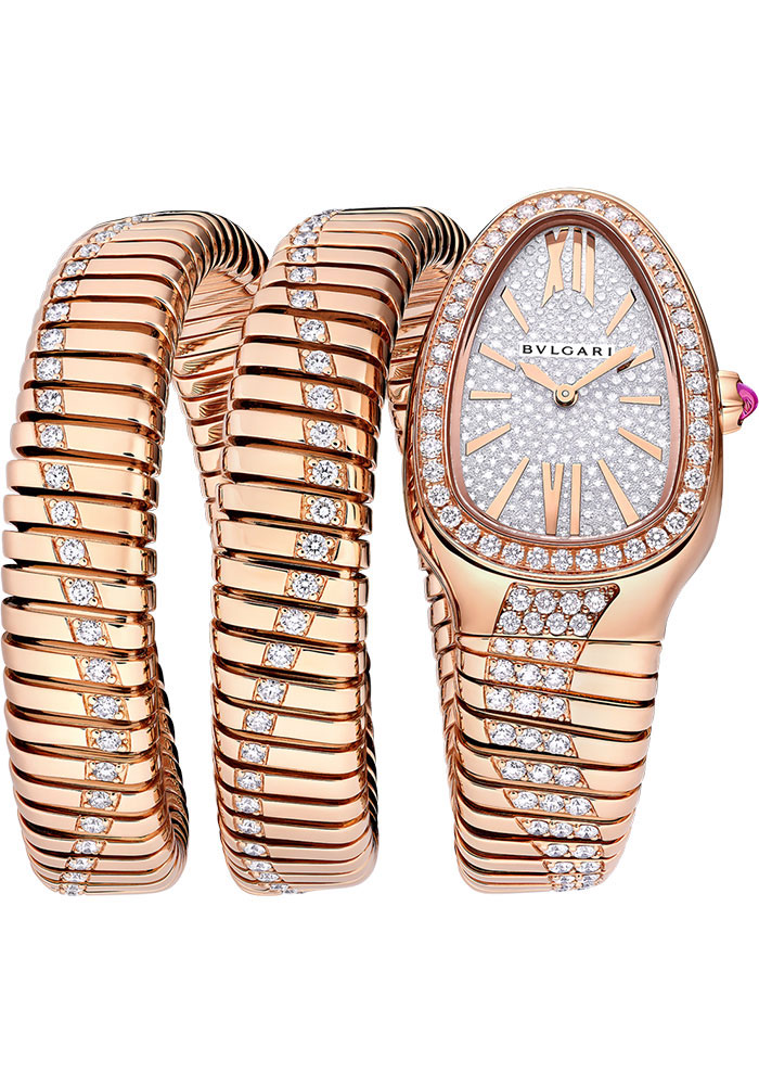 35 mm 18K rose gold case, 18K rose gold crown set with a cabochon-cut pink tourmaline, bezel set with diamonds, full pavé dial, quartz movement with hour-minute functions, serpenti tubogas infinity double-spiral rose gold bracelet set with brilliant-cut diamonds. Water resistant to 30 m.