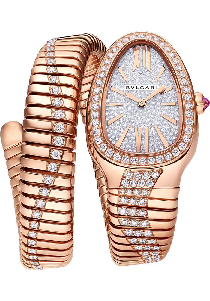 35 mm 18K rose gold case, 18K rose gold crown set with a cabochon-cut pink tourmaline, bezel set with diamonds, full pavé dial, quartz movement with hour-minute functions, serpenti tubogas infiniti single-spiral rose gold bracelet set with brilliant-cut diamonds. Water resistant to 30 m.