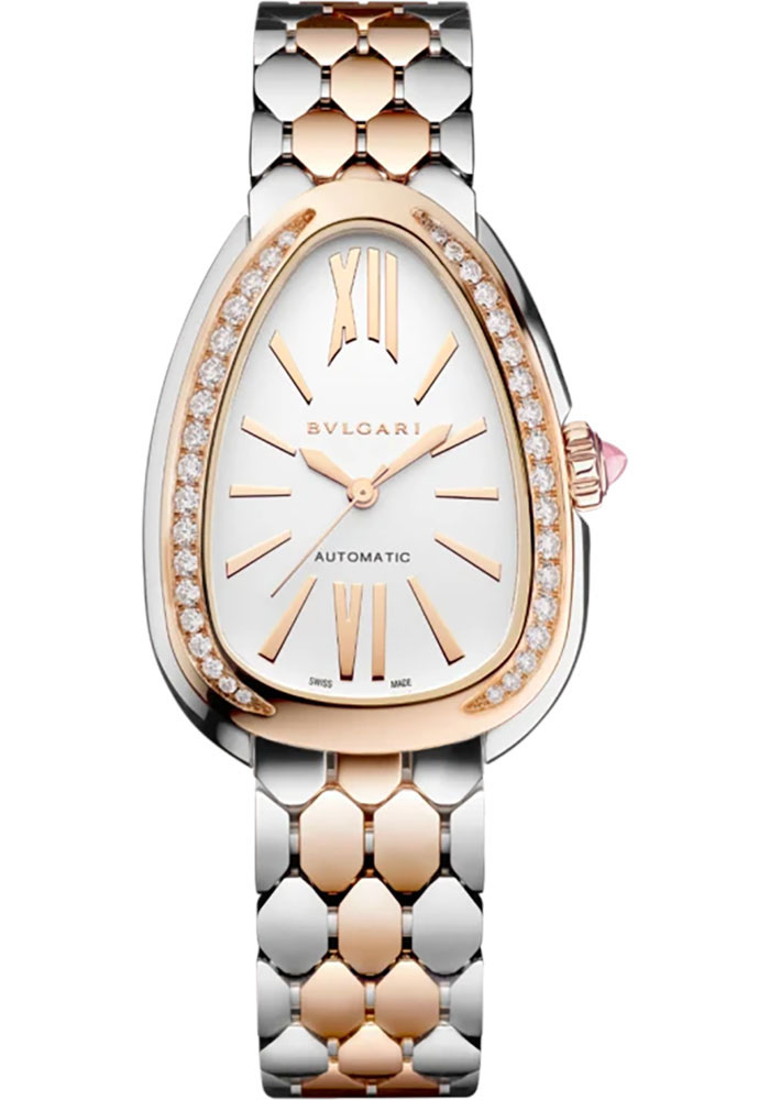 34 mm stainless steel case, 18K rose gold crown set with a cabochon-cut pink rubellite, diamond-set bezel, white opaline dial, BVS 100 caliber automatic movement with hour-minute functions, rose gold and steel bracelet with folding buckle. Water resistant to 30 m.