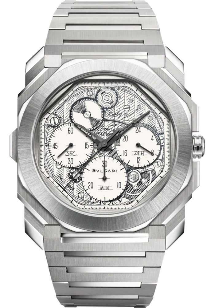 43 mm satin-polished stainless steel case, stainless steel crown with black ceramic insert, silver-finished dial, BVL 318 caliber automatic movement with chronograph gmt functions, approximately 55 hours of power reserve, stainless steel bracelet. Water resistant to 100 m.