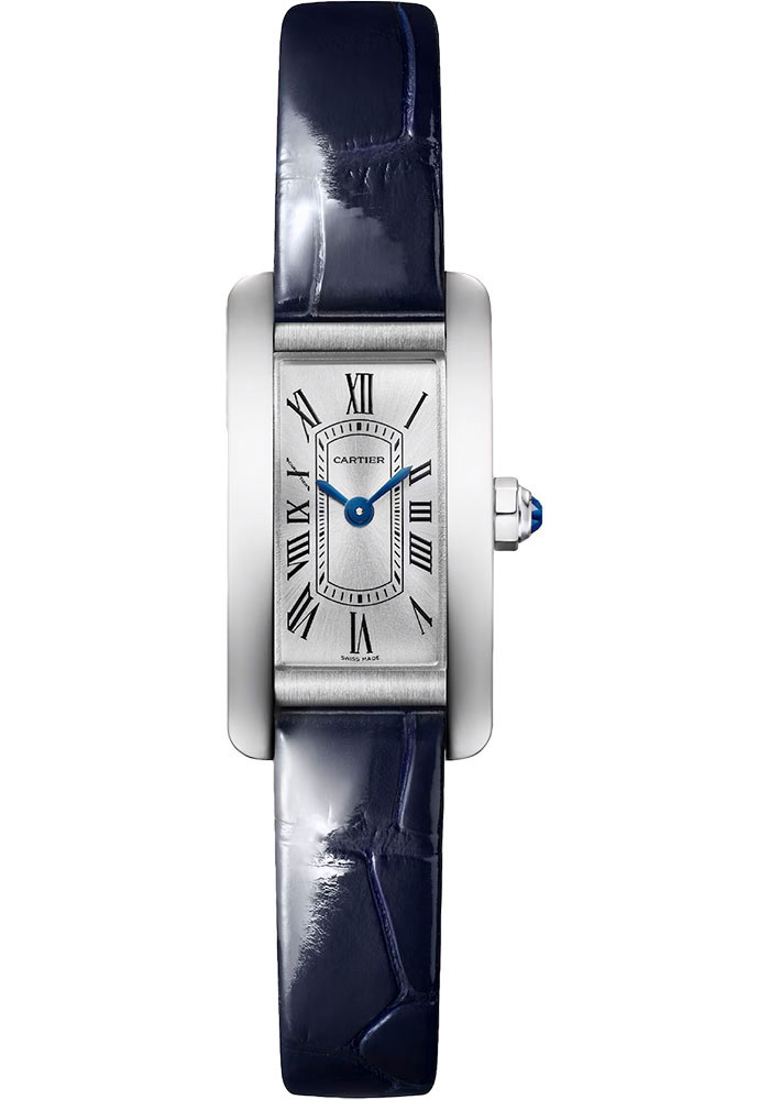 27.9 mm x 15.2 mm steel case, 6.52 mm thick, faceted crown with a faceted synthetic blue spinel, sapphire crystal, silvered sunray dial, quartz movement, shiny blue alligator-skin strap, steel ardillon buckle. Water resistant to 3 bar (approx 30 meters/100 feet).