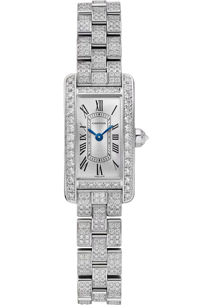 27.9 mm x 15.2 mm white gold case set with 40 brilliant-cut diamonds, 6.52 mm thick, 18K white gold octagonal crown set with an inverted diamond, satin-finished silvered dial with sunray-effect, quartz movement, 18K white gold bracelet semi-set with 168 pavé brilliant-cut diamonds totaling 0.83 carats. Water resistant to 3 bar (approx 30 meters/100 feet).