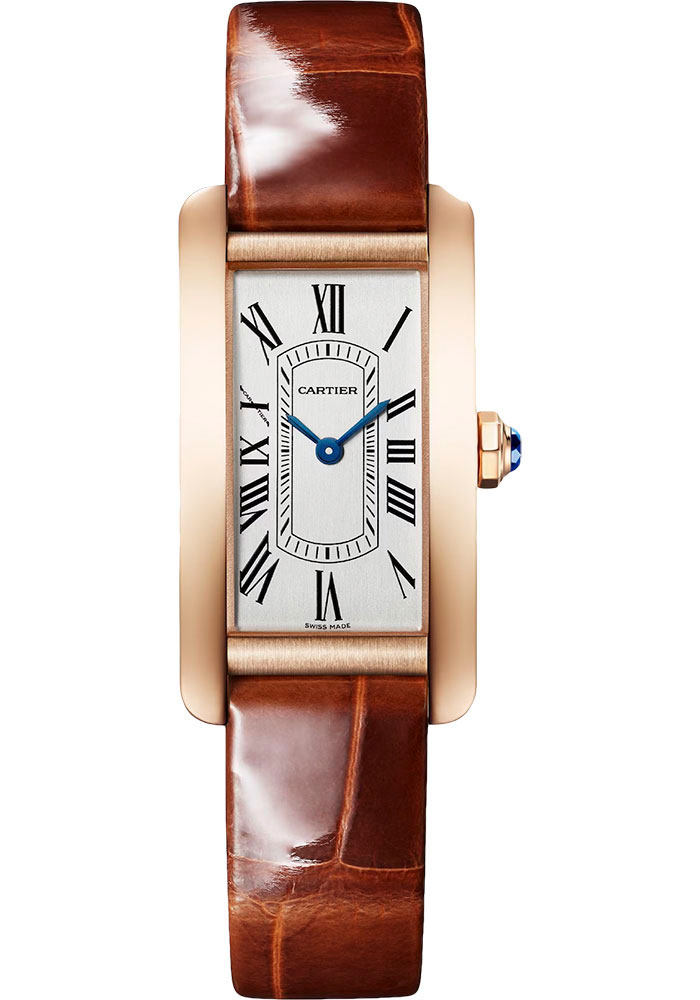 35.4 mm x 19.4 mm rose gold case, 6.76 mm thick, faceted crown set with a sapphire, sapphire crystal, silvered satin-brushed dial, quartz movement, dark brown shiny alligator-skin strap, 18K rose gold ardillon buckle. Water resistant to 3 bar (approx 30 meters/100 feet).