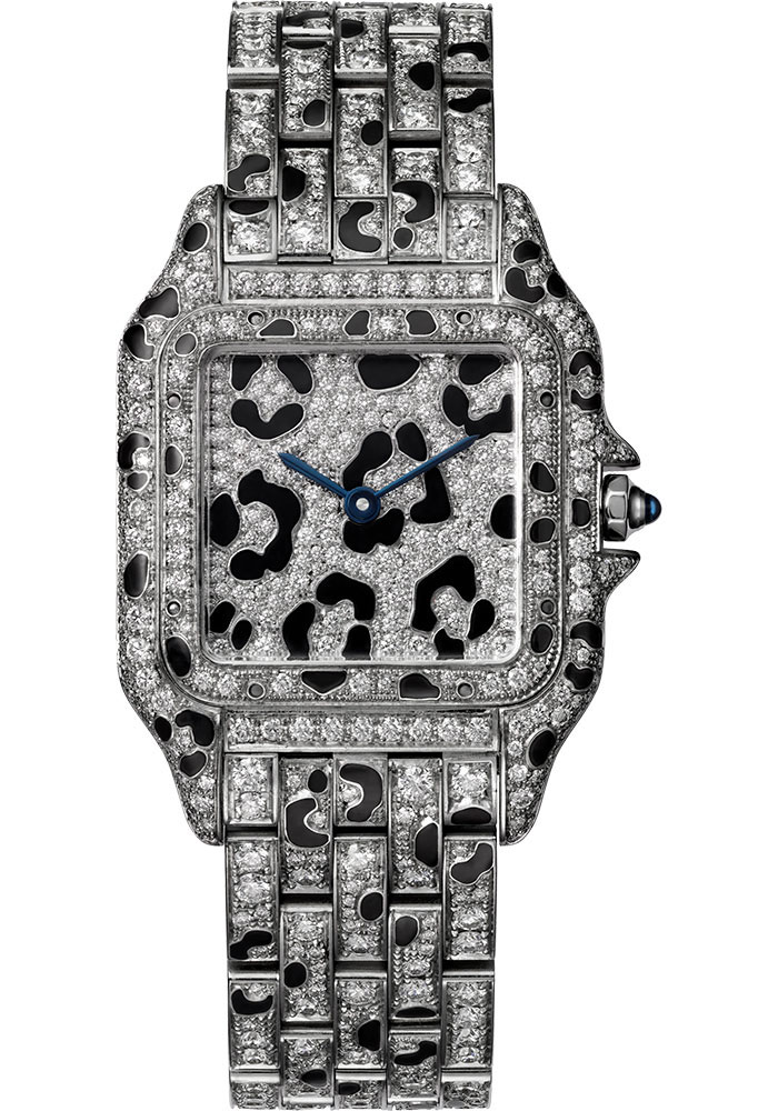 37 mm x 27 mm rhodiumized white gold case set with 168 brilliant-cut diamonds, enamel spots. crown decorated with a sapphire, rhodiumized white gold dial set with 118 brilliant-cut diamonds totaling 0.32 carats, quartz movement, rhodiumized white gold bracelet set with 374 brilliant-cut diamonds totaling 5.37 carats and enamel spots. Water resistant to 3 bar (approx 30 meters/100 feet).