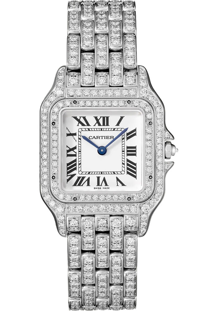 37 mm x 29 mm rhodiumized white gold case set with 415 brilliant-cut diamonds, crown decorated with a diamond, quartz movement, rhodiumized white gold bracelet set with 415 brilliant-cut diamonds totaling 7.80 carats. Water resistant to 3 bar (approx 30 meters).