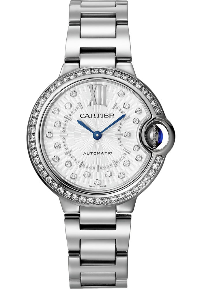 33 mm steel case, fluted steel crown set with a synthetic cabochon-shaped spinel.steel bezel set with 50 diamonds totaling 0.57 carats, steel bezel set with 50 diamonds, sapphire crystal, matte silvered sunray-brushed dial set with 21 brilliant-cut diamonds totaling 0.10 carats.blued-steel sword-shaped hands, automatic movement, interchangeable steel bracelet. Water resistant to 3 bar (approx 30 meters/100 feet).