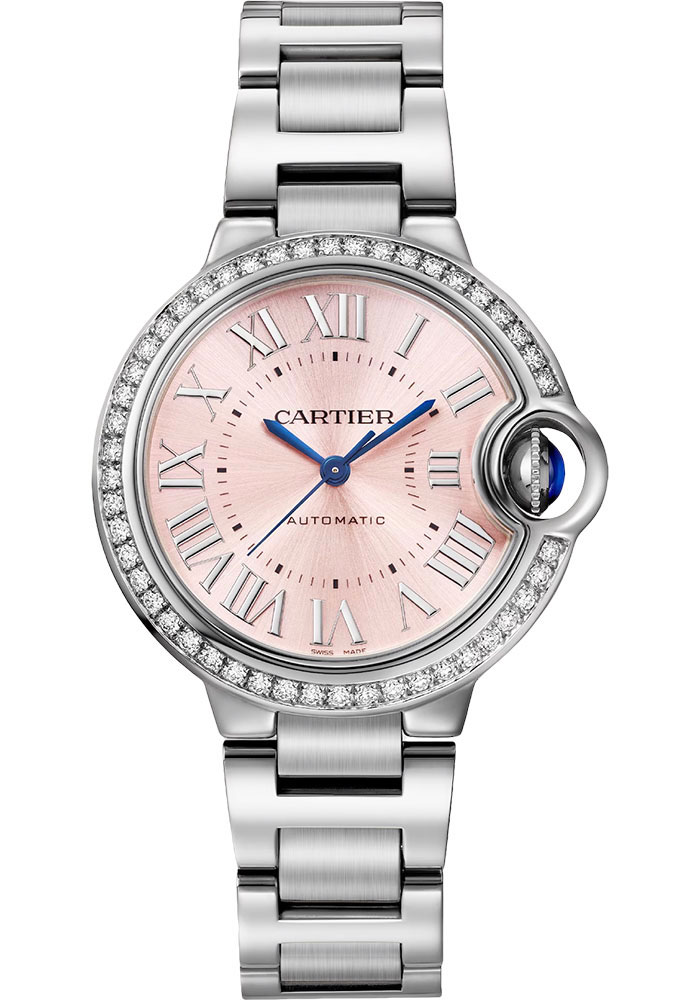 33 mm steel case, fluted steel crown set with a synthetic cabochon-shaped spinel.steel bezel set with 50 brilliant-cut diamonds totaling 0.57 carats, steel bezel set with 50 brilliant-cut diamonds, sapphire crystal, pink sunray dial, caliber 1853 automatic movement, interchangeable steel bracelet. Water resistant to 3 bar (approx 30 meters/100 feet).