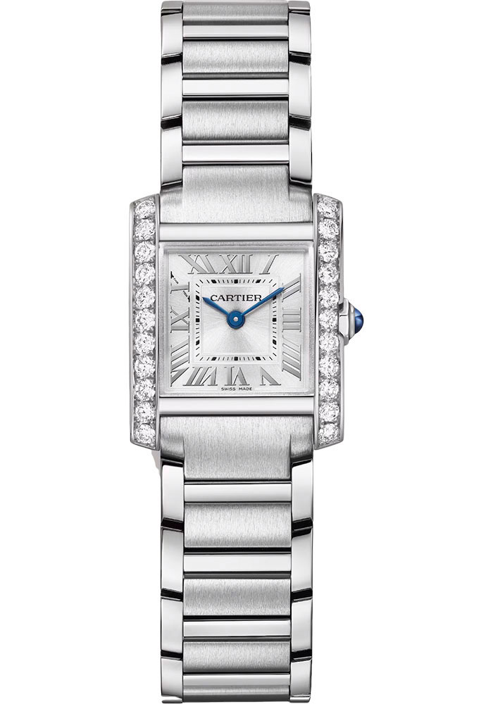 25.7 mm x 21.2 mm steel case set with 22 diamonds, 6.79 mm thick, steel faceted crown with a synthetic blue cabochon-shaped spinel, sapphire crystal, silvered sunray dial, quartz movement, steel bracelet. Water resistant to 3 bar (approx 30 meters/100 feet).