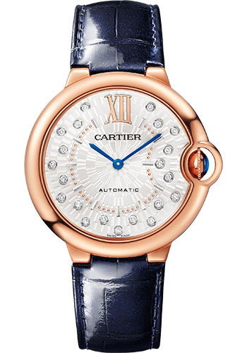 36 mm rose gold case, 0.47 in thick, fluted crown in rose gold set with a sapphire cabochon, sapphire crystal, matt silvered stamped sunray dial set with 21 brilliant-cut diamonds totaling 0.19 carats, self-winding mechanical movement, blue alligator leather strap, rose gold ardillon buckle. Water resistant to 3 bar (approx 30 meters/100 feet).