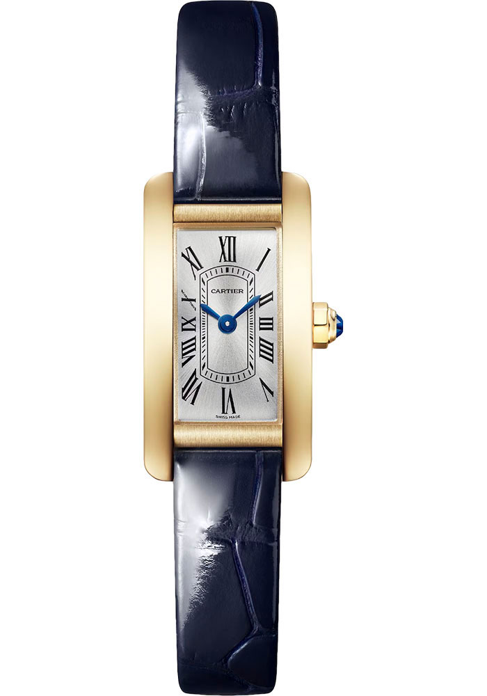 27.9 mm x 15.2 mm yellow gold case, 6.52 mm thick, faceted crown set with a faceted sapphire, sapphire crystal, satin-brushed silvered dial with sunray effect, quartz movement, shiny navy blue alligator leather strap, 18K yellow gold ardillon buckle. Water resistant to 3 bar (approx 30 meters/100 feet).