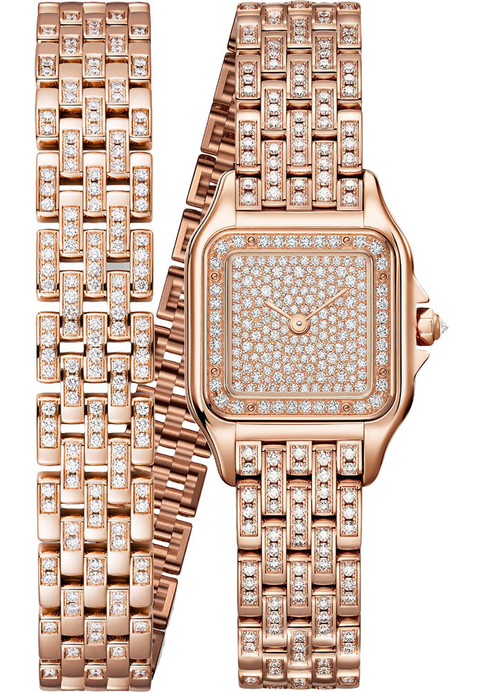 30.3 mm x 22.0 mm rose gold case set with 36 brilliant-cut diamonds, 6.32 mm thick, 18K rose gold octagonal crown set with a brilliant-cut diamond, 18K rose gold dial set with 172 brilliant-cut diamonds totaling 0.47 carats, quartz movement, 18K rose gold double loop bracelet semi-set with 286 brilliant-cut diamonds totaling 2.59 carats. Water resistant to 3 bar (approx 30 meters/100 feet).
