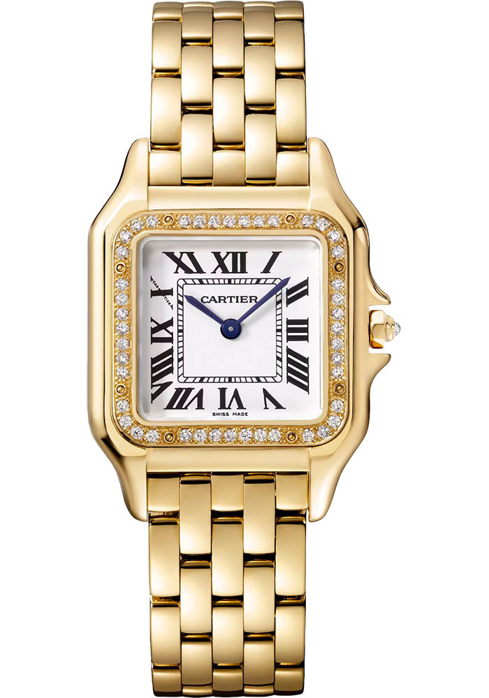 27 mm x 36 mm yellow gold case set with brilliant-cut diamonds, crown set with a diamond, silvered dial, quartz movement, yellow gold bracelet.