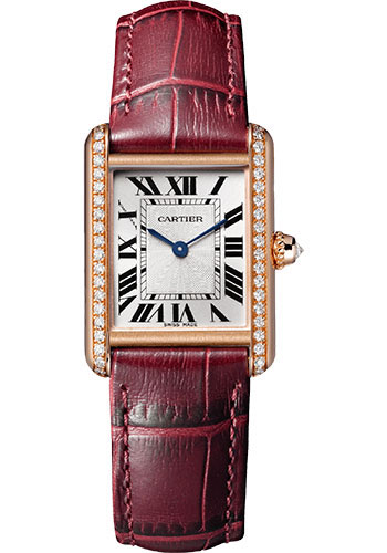 29.5 mm x 22.0 mm rose gold case set with 41 brilliant-cut diamonds, 6.8 mm thick, beaded crown in rose gold set with 41 brilliant-cut diamonds totaling 0.47 carat, mineral crystal, silver-grained dial, manual movement, claret alligator-skin strap, ardillon buckle. Water resistant to 3 bar (approx 30 meters/100 feet).