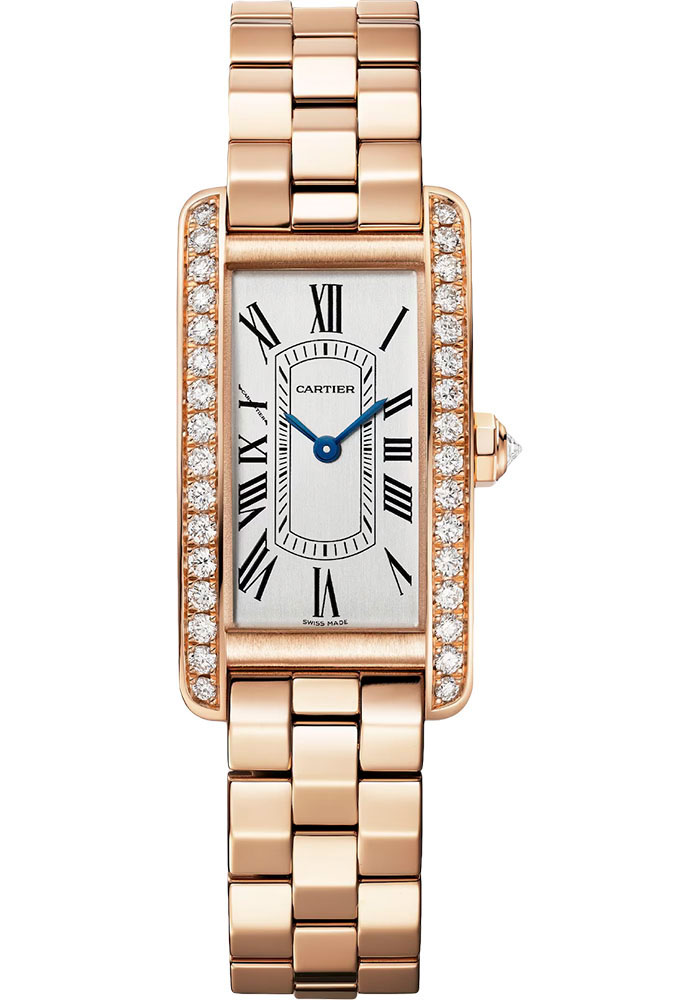 35.4 mm x 19.4 mm rose gold case and faceted crown set with 33 brilliant-cut diamonds, 6.76 mm thick, faceted crown, sapphire crystal, silvered satin-brushed dial, quartz movement, 18K rose gold bracelet. Water resistant to 3 bar (approx 30 meters/100 feet).