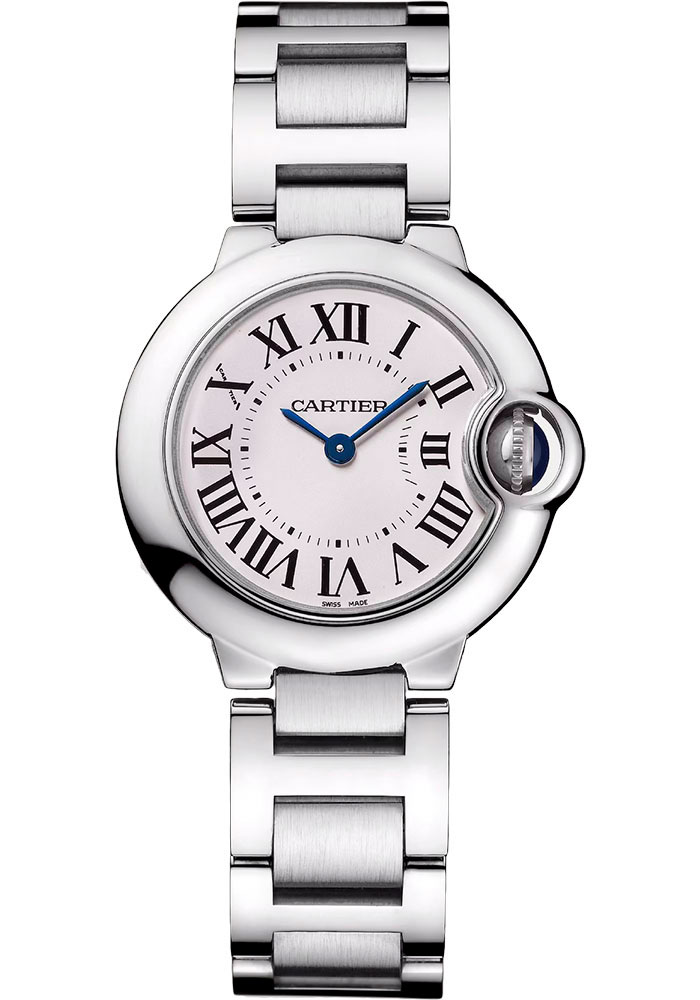 1.1 inthickness: 0.34 in steel case, 9.35 mm thick, fluted crown set with a synthetic cabochon-shaped spinel, sapphire crystal, silvered opaline dial, quartz movement, interchangeable steel bracelet. Water resistant to 3 bar (approx 30 meters/100 feet).
