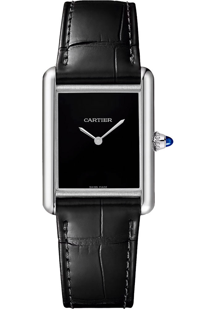 33.7 mm x 25.5 mm steel case, 6.60 mm thick, beaded crown set with a synthetic cabochon-shaped spinel, black lacquered dial, quartz movement, semi-matt black alligator leather strap, steel ardillon buckle. Water resistant to 3 bar (approx 30 meters/100 feet).
