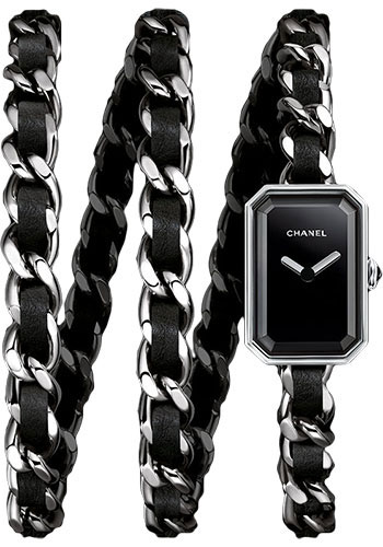 15.8 mm x 23.6 mm steel case, 6.2 mm thick, onyx cabochon crown, steel bezel, black lacquered dial, quartz movement, triple row steel bracelet. Water resistant to 30 meters.