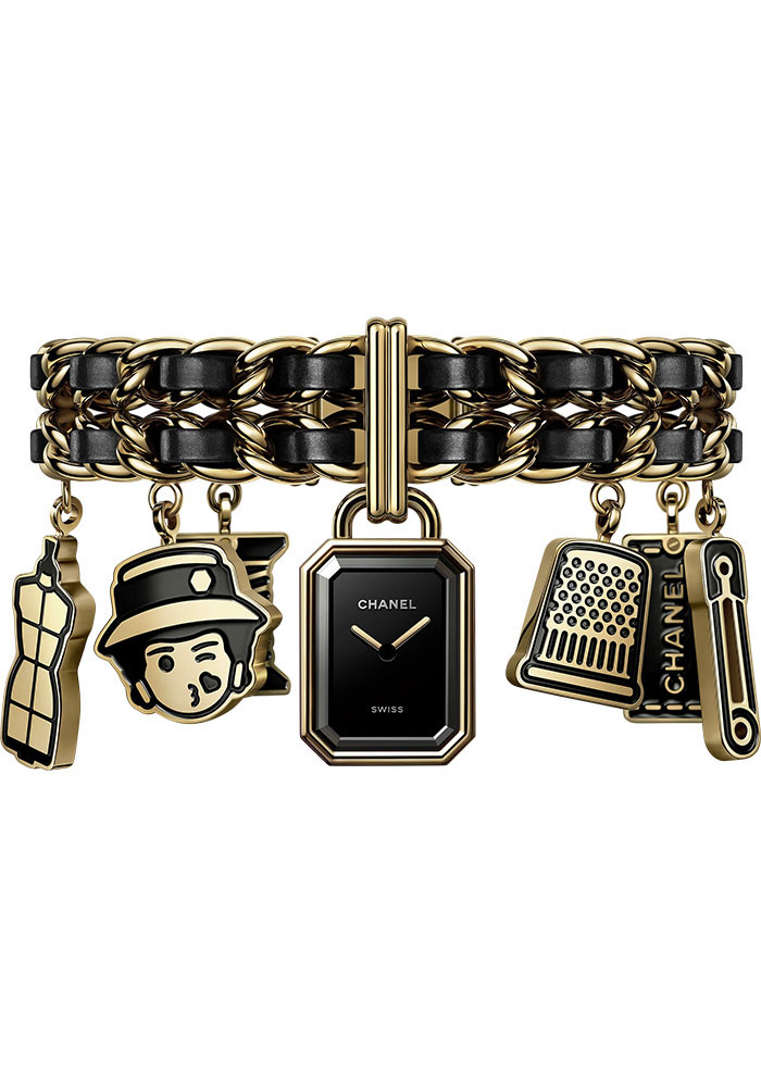 19.7 x 15.2 mm steel case coated with 18K yellow gold (0.1 micron), 7.5 mm thick, black-lacquered dial, high precision quartz movement, steel chain bracelet coated with 18k yellow gold (0.1 micron) interlaced with black leather strap, steel chain bracelet coated with 18k yellow gold (0.1 micron) interlaced with black leather strap. Water resistant to 30 m.