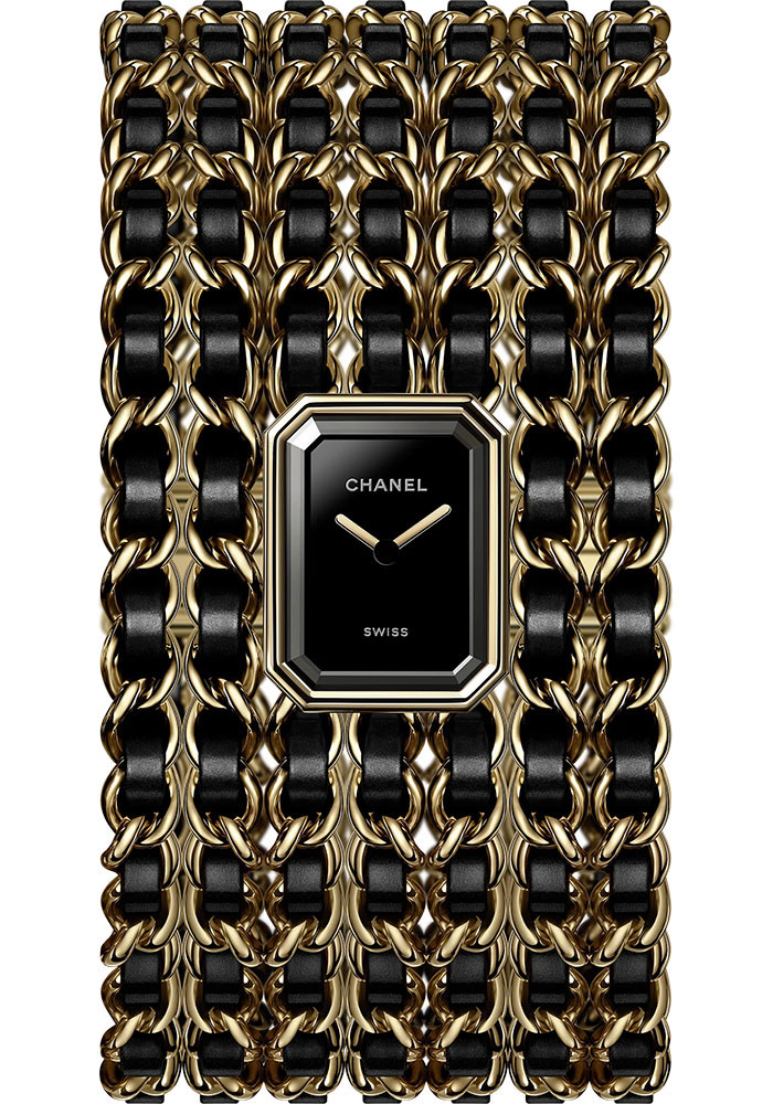 19.7 x 15.2 mm steel case coated with 18K yellow gold (0.1 micron), 7.5 mm thick, black-lacquered dial, high precision quartz movement, steel chain bracelet coated with 18k yellow gold (0.1 micron) interwoven with black leather. Water resistant to 30 m.