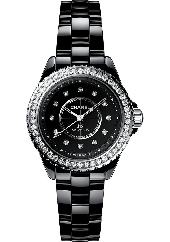 33 mm black ceramic and steel case, 12.94 mm thick, steel screw-down crown with black highly resistant ceramic cabochon, steel fixed bezel set with 46 brilliant-cut diamonds (~1.21 carat), black-lacquered dial set with 12 diamond indicators (~0.06 carat), caliber 12.2self-winding mechanical ≈ 50h movement, black highly resistant ceramic bracelet, steel triple-folding buckle. Water resistant to 50 m.