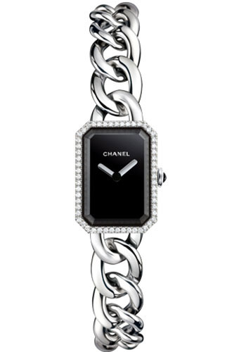 16mm x 22mm x 6.2mm stainless steel case, solid back, onyx cabochon crown, steel bezel set with 56 brilliant-cut diamonds (~ 0.19 carats), black lacquered dial, high-precision quartz movement with hours, minutes, steel chain bracelet, buckle in steel. Water resistant to 30 meters.