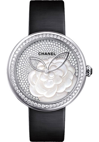 37.5 mm 18K white gold case set with 60 brilliant-cut diamonds - 1K, onyx cabochon crown, diamond bezel, mother-of-pearl dial set with 330 brilliant-cut diamonds - 1.02K and decorated with a camellia in mother-of-pearl marquetry, self-winding movement, approximately 42 hour of power reserve, black satin strap, 18K white gold buckle set with 80 brilliant-cut diamonds - 0.49K. Water resistant to 30 meters.