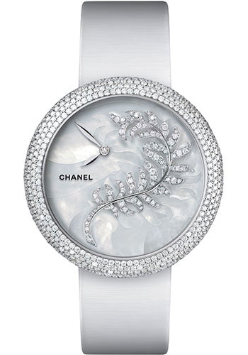 37.5 mm 18K white gold case set with 570 brilliant-cut diamonds (~3.14 carats), 9.84 mm thick, mother-of-pearl marquetry and feather motif dial set with 96 brilliant-cut diamonds (~0.24 carat), high precision quartz movement, white satin strap, 18K white gold folding buckle set with 80 brilliant-cut diamonds (~0.49 carat). Water resistant to 30 m.