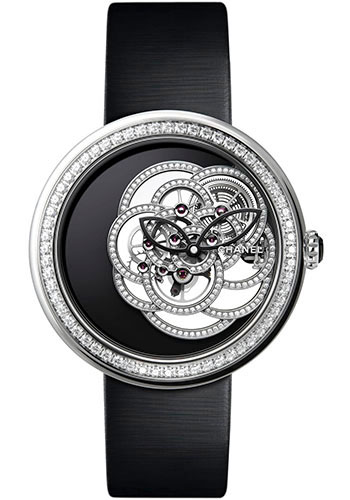Chanel Style No: H5471 Chanel Mademoiselle Privé Camélia Skeleton Manual-Wind Watch - White Gold Case - Diamond Bezel - Black Satin Strap