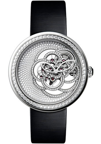 37.5 mm 18K white gold case, 10.45 mm thick, crown with onyx cabochon, bezel set with 60 brilliant-cut diamonds (~1.00 carat), manual-winding mechanical movement with hours, minutes, black satin strap, 18K white gold double folding buckle set with 80 brilliant-cut diamonds (~0.48 carat). Water resistant to 30 m.