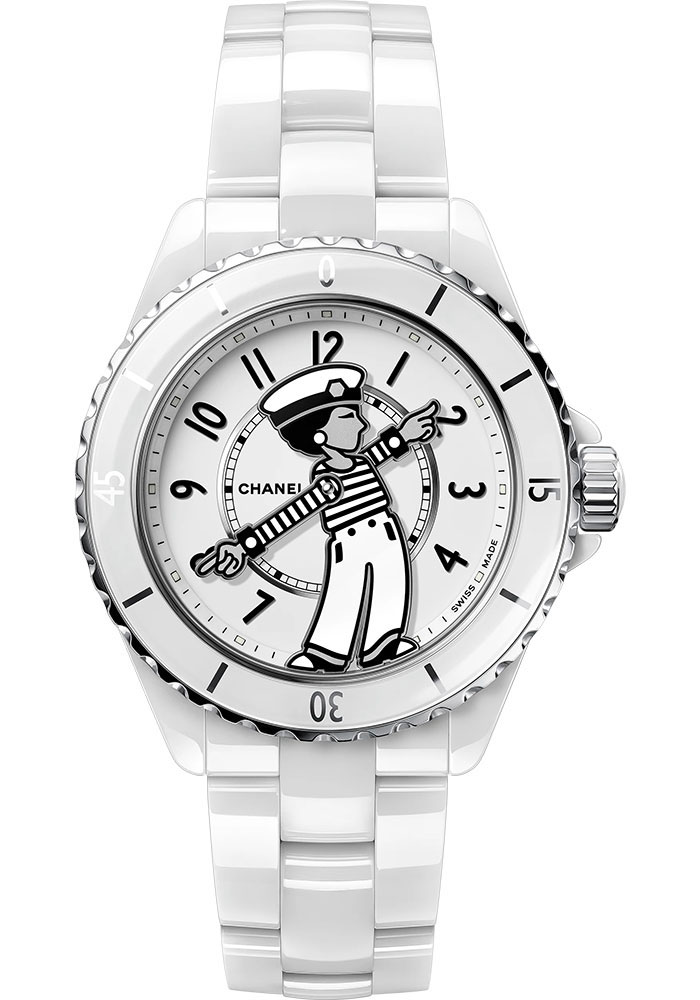 38 mm white ceramic and steel case, 12.6 mm thick, steel screw-down crown with white highly resistant ceramic cabochon, white-varnished sapphire crystal and steel unidirectional rotating bezel, white-lacquered dial with a statuette of Mademoiselle Chanel, self-winding mechanical movement, white highly resistant ceramic bracelet, steel triple-folding buckle. Water resistant to 200 m.
