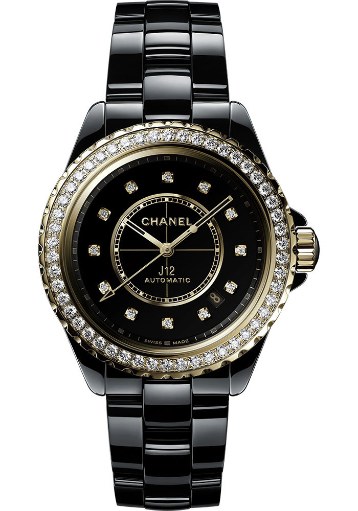 38 mm black ceramic and 18K yellow gold case, 12.6 mm thick, 18K yellow gold non screw-down crown with black highly resistant ceramic cabochon, 18K yellow gold fixed bezel set with 50 brilliant-cut diamonds (~1.51 carat), black-lacquered dial set with 12 diamond indicators (~0.09 carat), caliber 12.1self-winding mechanical ˜ 70h movement, black highly resistant ceramic bracelet, steel triple-folding buckle. Water resistant to 50 m.
