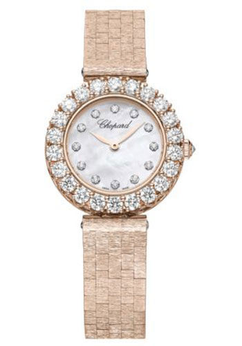 26.00 mm 18k rose gold case with diamonds, crown set with 1 diamond briolette, mother-of-pearl dial, l'heure du diamant round small, 26.00 mm diameter. 18k rose gold case and 18k rose gold bracelet with folding buckle. prong-setting with 22 diamonds = 2.20 cts. crown: 1 diamond briolette = 0.03 ct. dial: mother-of-pearl dial with 12 diamond indexes = 0.05 ct approx.. hand-wound mechanical movement, approximately 30 hours of power reserve, 18k rose gold bracelet.