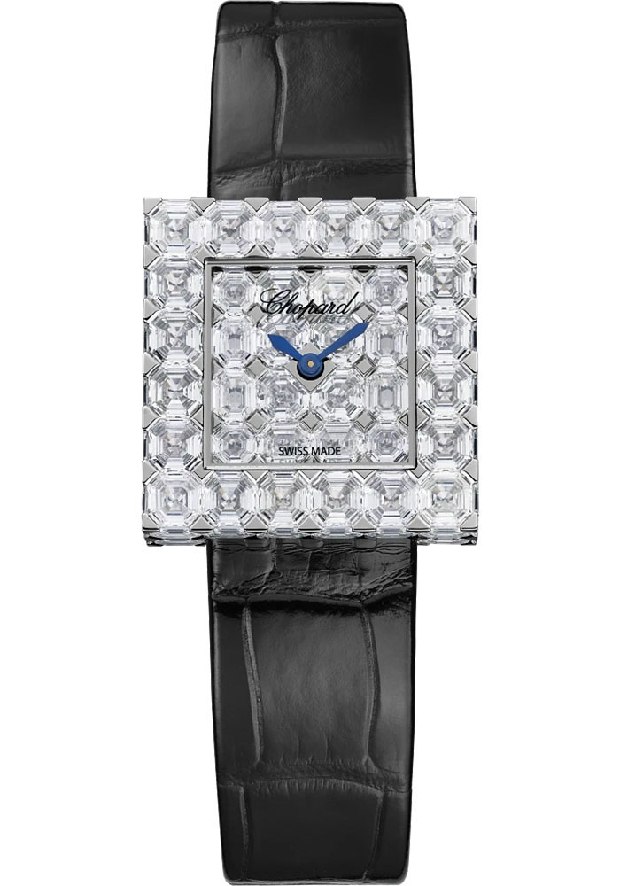 25 mm 18k white gold case with closely aligned polished and sparkling trapeziums, diamond paved dial.