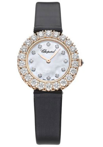 26.00 mm 18k rose gold case with diamonds, crown set with 1 diamond briolette, mother-of-pearl dial, l'heure du diamant round small, 26.00 mm diameter. 18k rose gold case and diamond-set 18k rose gold pin buckle. prong-setting with 22 diamonds = 2.20 cts. crown: 1 diamond briolette = 0.03 ct. dial: mother-of-pearl dial with 12 diamond indexes = 0.05 ct approx.. hand-wound mechanical movement, approximately 30 hours of power reserve.
