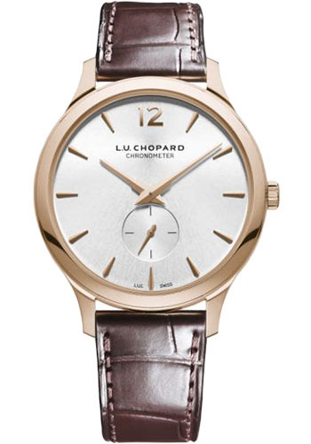 40.00 mm 18k rose gold case, galvanic silver dial, self-winding mechanical movement with hours and minutes, small seconds, approximately 65 hours of power reserve, brown alligator leather strap with matt square plate and hand sewn matching tones, pin buckle. Water resistant to 30 meters.