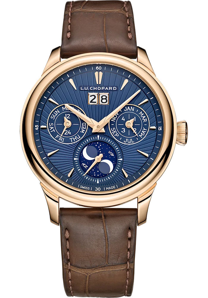 40.5 mm 18k rose gold case, 11.60 mm thick, see-through sapphire crystal back, 18k rose gold crown, dark blue dial with a dark blue color and handcrafted guilloché finish, self-winding mechanical movement with date, small seconds, hours and minutes, approximately 65 hours of power reserve, soft touch brown alligator leather strap, 18k rose gold folding buckle.