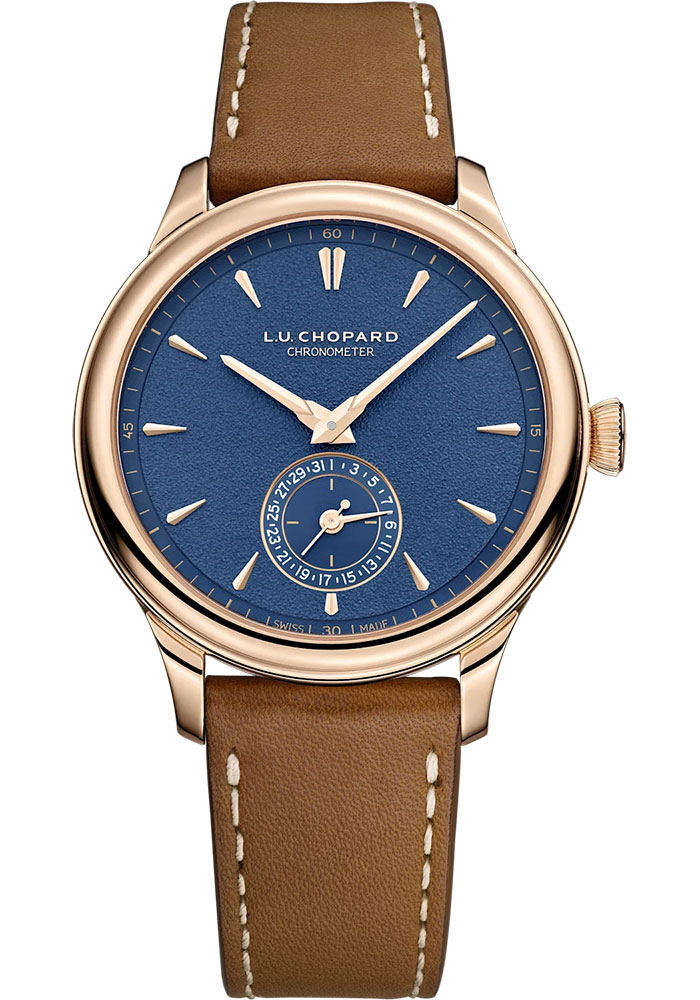 39 mm 18k rose gold case, 10.40 mm thick, see-through sapphire crystal back, 18k rose gold crown, deep blue dial, hand-wound mechanical movement with date, small seconds, hours and minutes, power-reserve indicator, approximately 216 hours of power reserve, matt square plate gray alligator leather strap, 18k rose gold pin buckle.