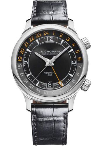 42.00 mm stainless steel case, galvanic black dial, self-winding mechanical movement with hours and minutes, seconds, date, dual time-zone display, approximately 60 hours of power reserve, black alligator leather strap with matt square plate and hand sewn matching tones, pin buckle. Water resistant to 50 meters.