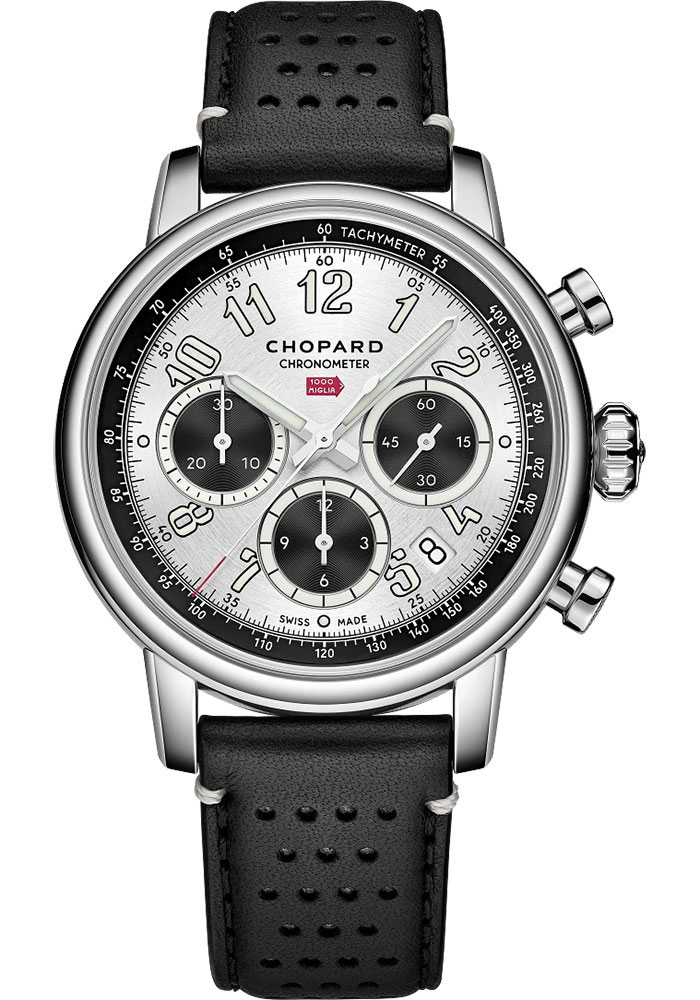 40.5 mm stainless steel case, 12.88 mm thick, see-through sapphire crystal back, stainless steel crown, two-tone la gara dial dial with a circular satin-finish silver silver-toned background, punctuated with black counters, self-winding mechanical movement with date, small seconds, hours and minutes, 12-hour counter, 30-minute counter, chronograph seconds hand, matt black calfskin leather perforated strap, stainless steel pin buckle. Water resistant to 50 meters.