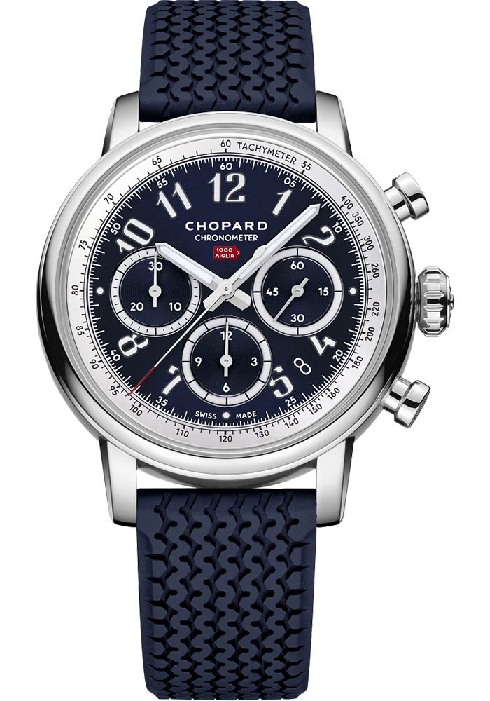 40.5 mm stainless steel case, 12.88 mm thick, see-through sapphire crystal back, stainless steel crown, lacquered blue dial with super-luminova, self-winding mechanical movement with date, small seconds, hours and minutes, 12-hour counter, 30-minute counter, chronograph seconds hand, tire profile blue rubber strap, stainless steel pin buckle. Water resistant to 50 meters.