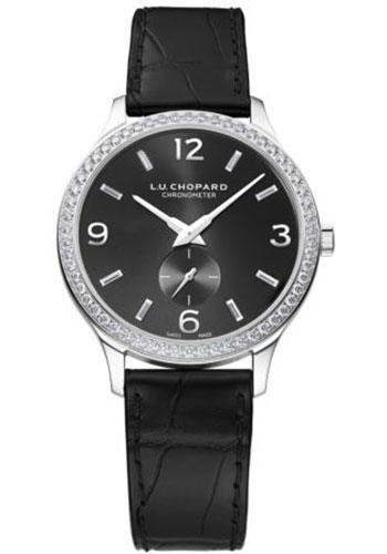 40.00 mm 18k white gold case with diamonds, 7.20 mm thick, diamond-set bezel, black dial with baguette diamonds, self-winding mechanical movement with hours and minutes, small seconds, approximately 65 hours of power reserve, black alligator leather strap, pin buckle. Water resistant to 30 meters.