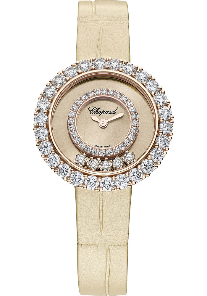 29 mm 18k rose gold case with diamonds, see-through sapphire crystal back, 18k rose gold crown, crystal with dancing elements, gold-toned dial with sunburst satin-brushed motif, quartz movement with hours and minutes, nacreous beige alligator leather strap, 18k rose gold pin buckle. Water resistant to 30 meters.