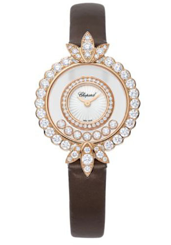 29.35 mm ethical white gold case with diamonds, guilloché mother-of-pearl dial, quartz movement with hours and minutes, pin buckle.